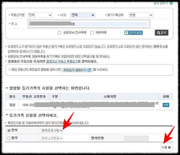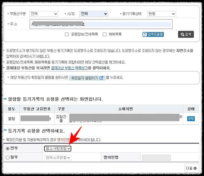6. 말소사항까지 다 보려면 등기기록 유형을 '말소사항 포함'으로 선택합니다. 그러면 그동안 그 부동산의 역사를 알 수 있어요. 대체로 현재의 소유자 상황만 볼 경우가 많습니다. 현재 유효사항 체크 후 다음으로 넘어갑니다.