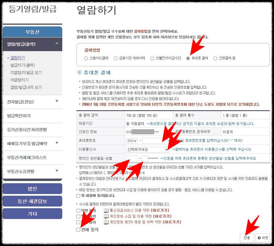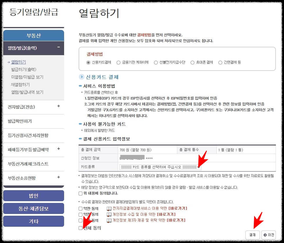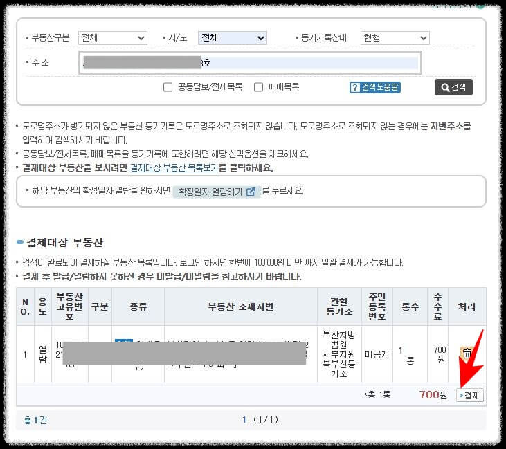 8. 결제를 누릅니다. 열람 비용은 700원, 발급 비용은 1,000원입니다.