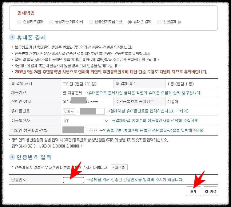 13. 인증번호 넣고 결제를 클릭하면 완료입니다.