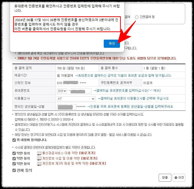 12. 3분 이내에 본인의 휴대폰 인증 번호를 확인 후에 인증을 진행합니다.